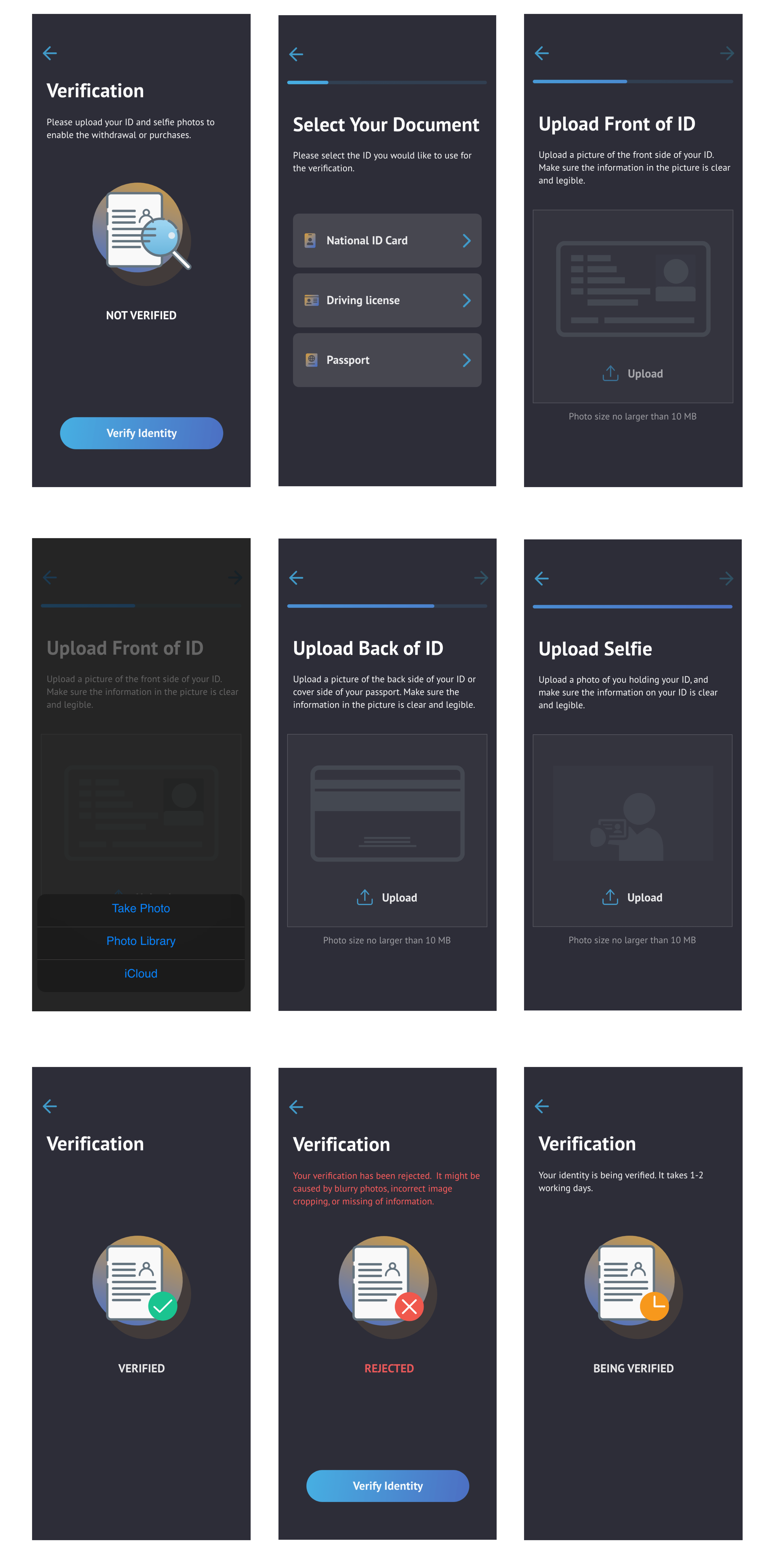 KYC is a process asking users to provide personal information to verify their identifications for maximum data security and prevents its users from breach or theft. As cryptocurrency investors, they want to have a smooth experience with low friction when participating in investment activities to accomplish their goals efficiently and delightfully. Therefore, the main problem I am solving here is to find the balance of security and efficiency.