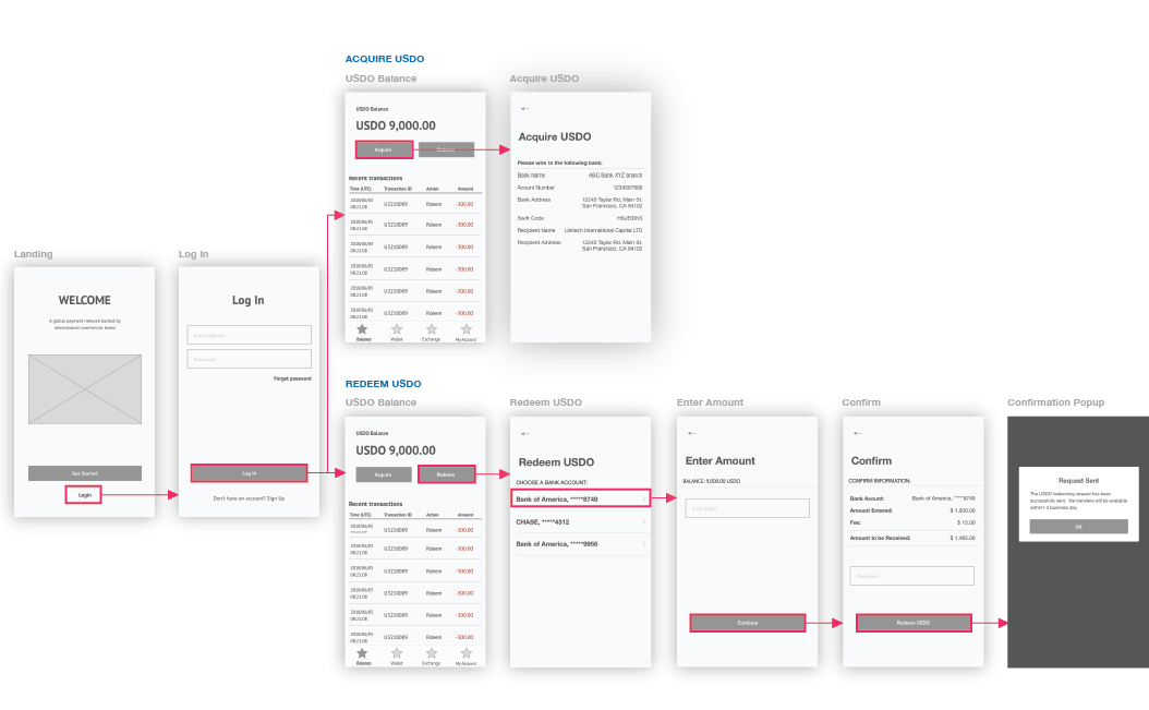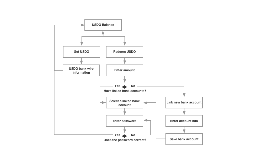 As shown on the storyboard, acquiring USDO was depositing USD to the bank, and redeeming USDO was cashing out USD from the bank. The idea is similar to the currency exchange, where USD and USDO are two different currencies. Analogous to the concept of deposits and withdrawals in traditional banks, I developed user flows.