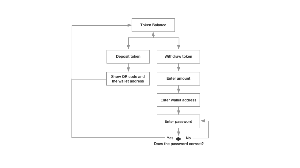 The Cryptocurrency Wallet stores the public and private keys for transferring cryptocurrencies. I researched competitive products and got inspired by traditional mobile APPs. The dynamic is straightforward; deposit and withdraw tokens are the main actions, indicating the “in” and “out” direction of money flow. Then I generated the following user flows.