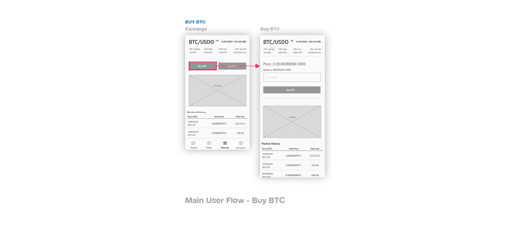 The purpose of investors trading cryptocurrencies is similar to trading stocks in the capital market, and the dynamics are identical too. To empathize with users better, I turned myself into a user trying out similar products. During this exploration, I paid attention to my feelings, where I believe design decisions can potentially influence users’ trading decision-making. The place an order process is the same as the shopping process: what I want to buy, what the price is, how many I want to buy, and the total cost, and confirm payment. Then I designed the order placing process - Choose a trading pair, view price, enter quantity, and confirm buy/sell.