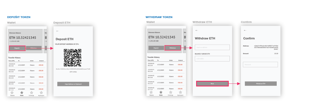 In the first version, we only included essential functions: deposit token, withdraw token, and transfer history. After some sketches and exploration, the low fidelity wireframes were generated.