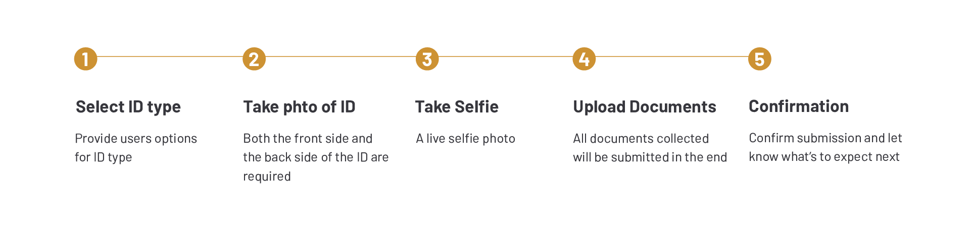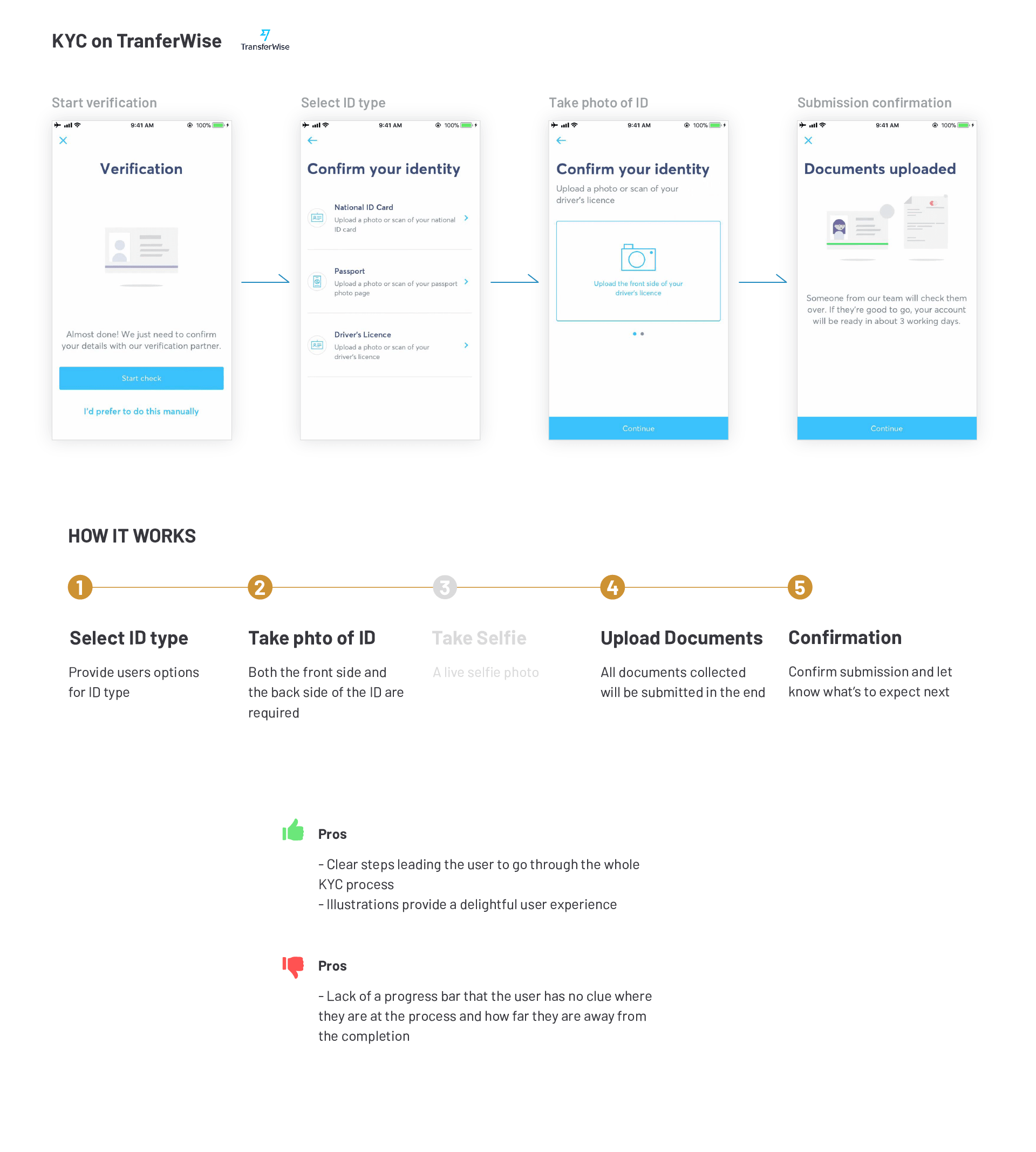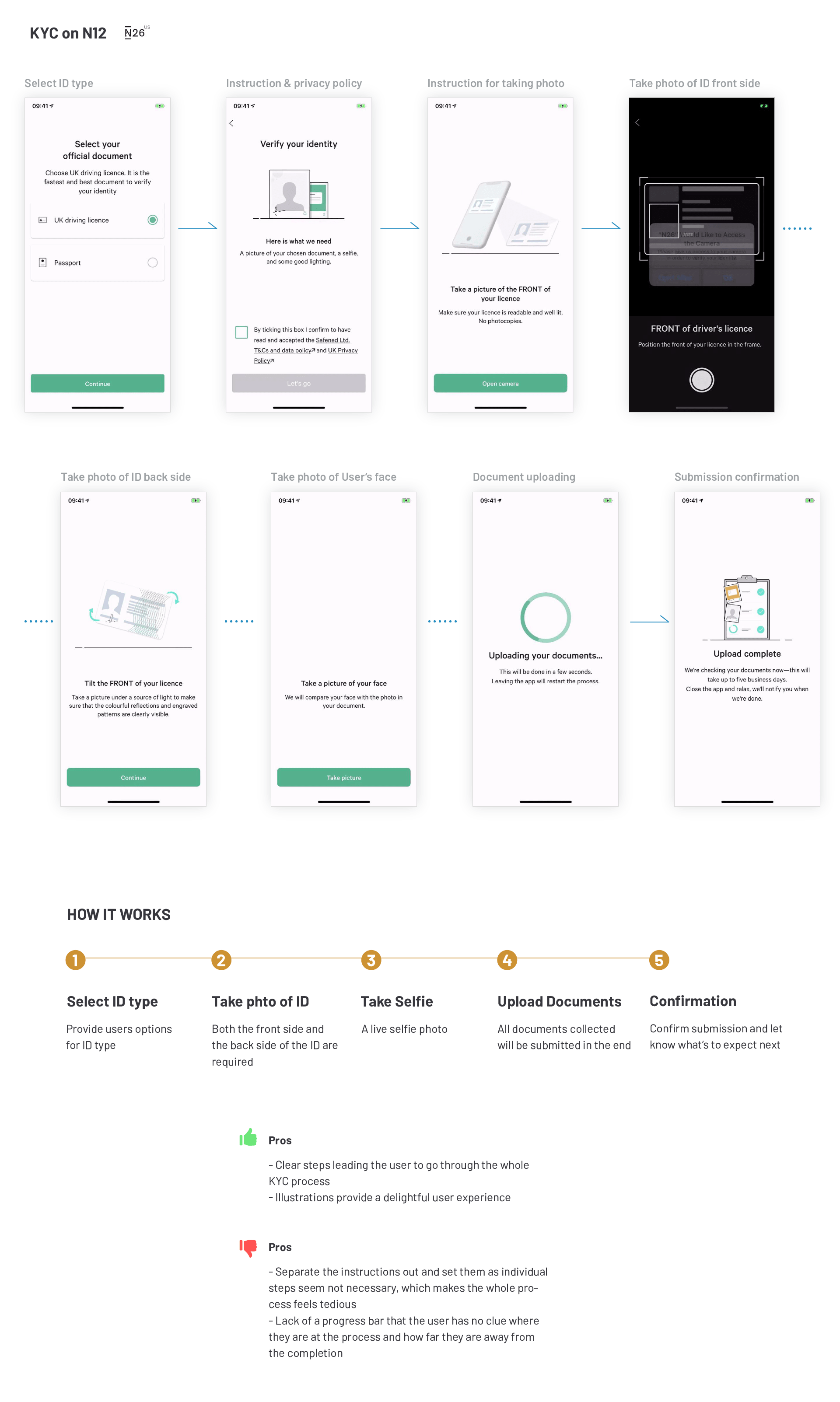 Competitor analysis shows that almost all KYC processes follow a similar procedure: select ID type, take photos of both sides of ID, and take a selfie. I decided to follow this convention and take advantage of users’ existing knowledge from other products they used before.