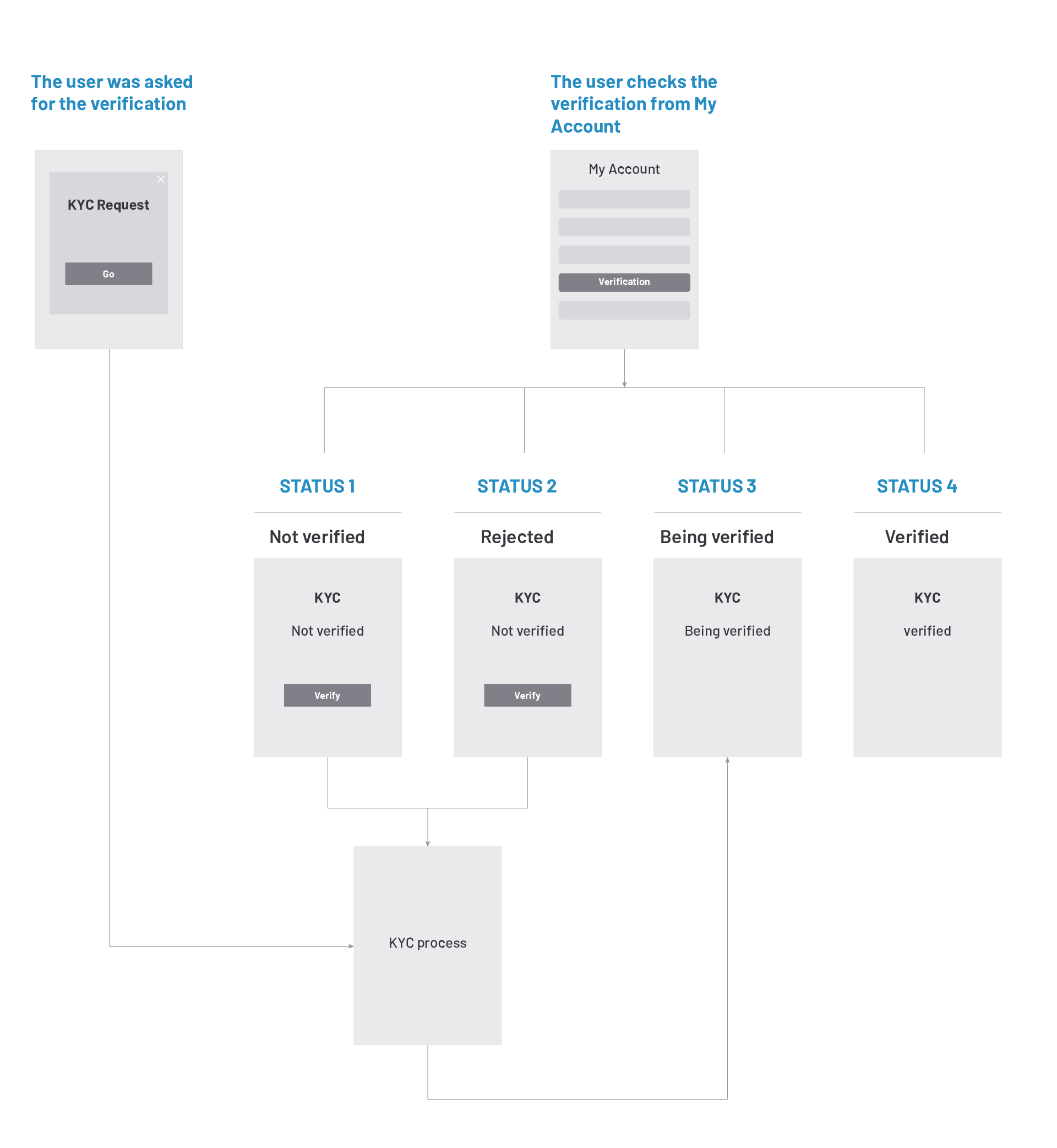Then, following the scenarios, I outlined the user flows, showing the experience of how to accomplish the KYC process and all possible verification statuses.