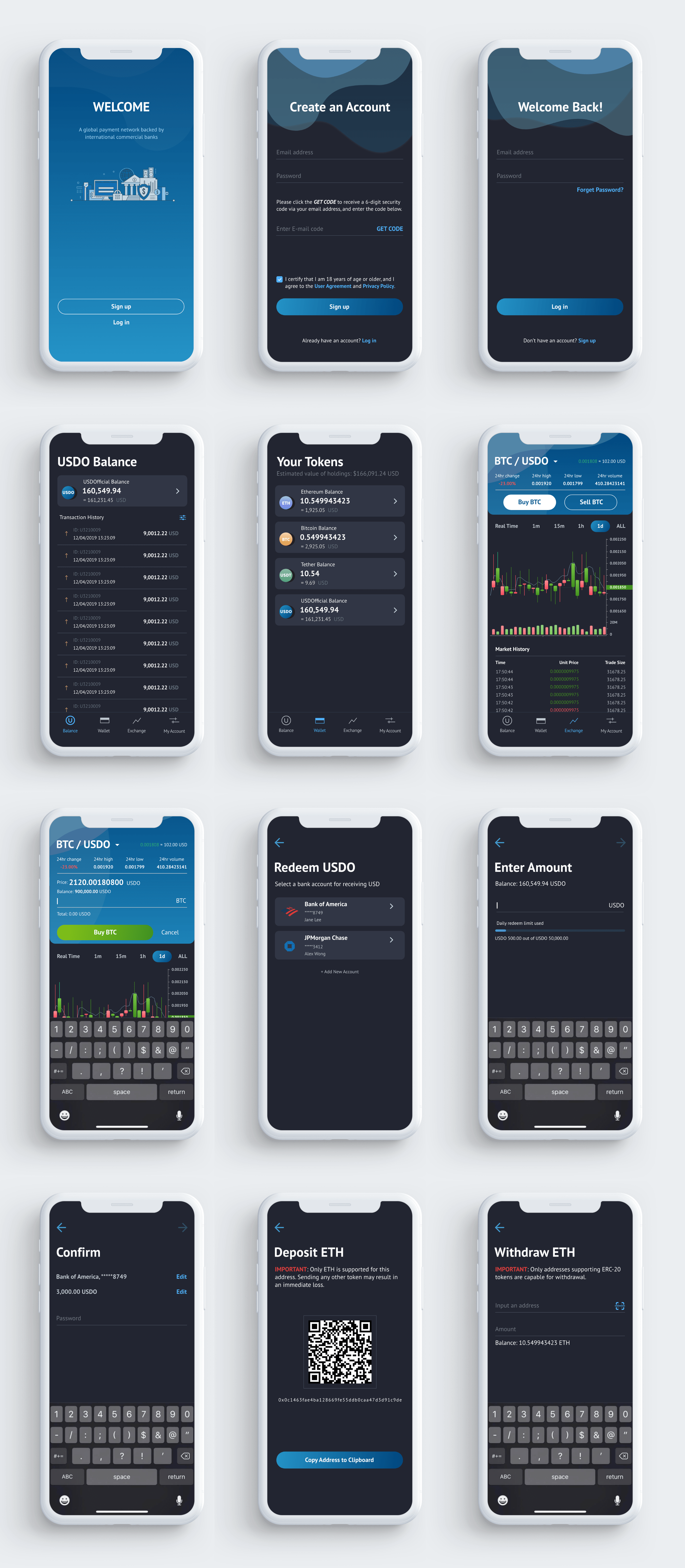 The Cryptocurrency Wallet stores the public and private keys for transferring cryptocurrencies. I researched competitive products and got inspired by traditional mobile APPs. The dynamic is straightforward; deposit and withdraw tokens are the main actions, indicating the “in” and “out” direction of money flow. Then I generated the following user flows.