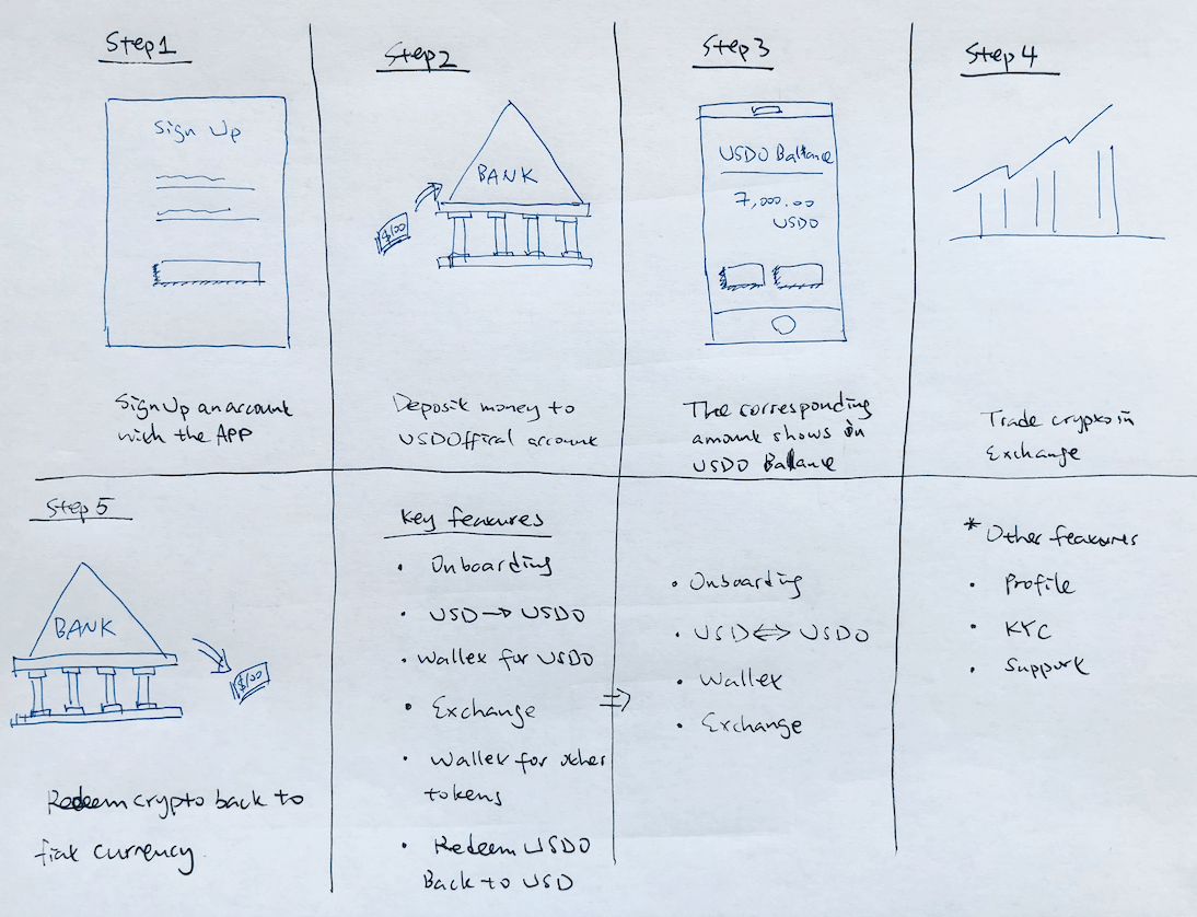 As shown on the storyboard, acquiring USDO was depositing USD to the bank, and redeeming USDO was cashing out USD from the bank. The idea is similar to the currency exchange, where USD and USDO are two different currencies. Analogous to the concept of deposits and withdrawals in traditional banks, I developed user flows.